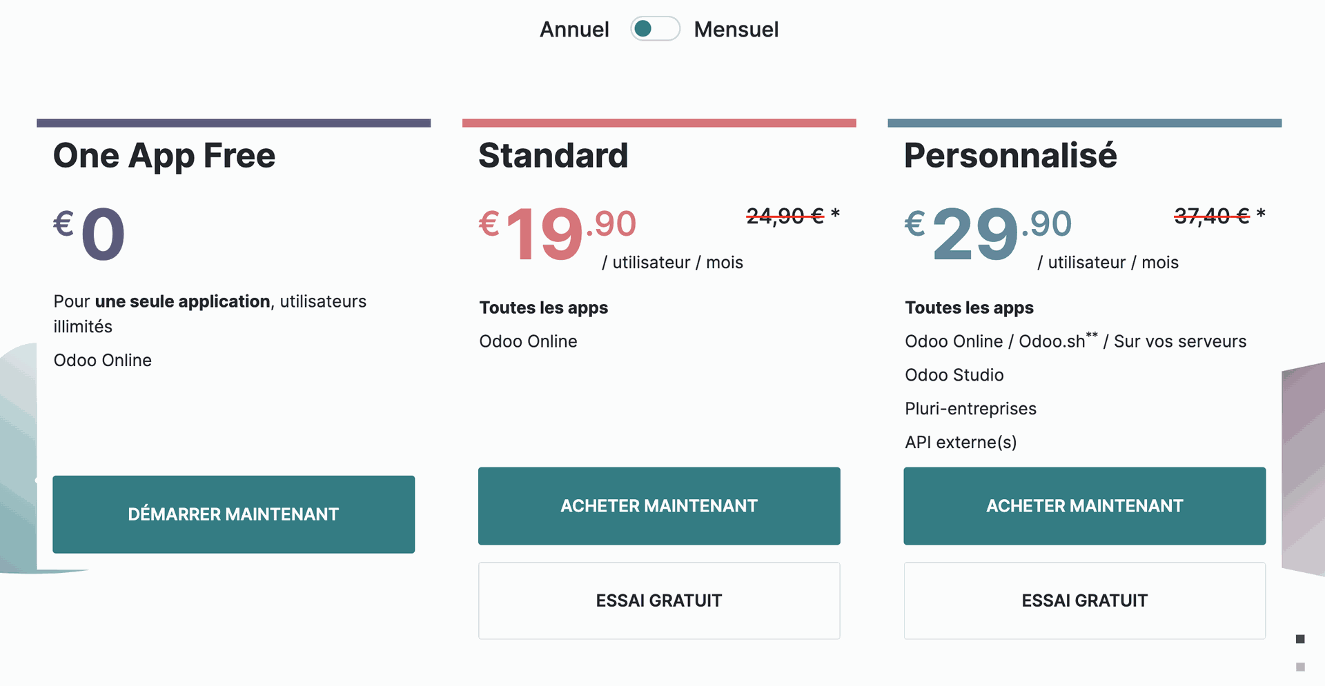 Les prix indiqués sont par utilisateur et par mois. Avec cette tarification, vous pouvez bénéficier de toutes les applications Odoo.