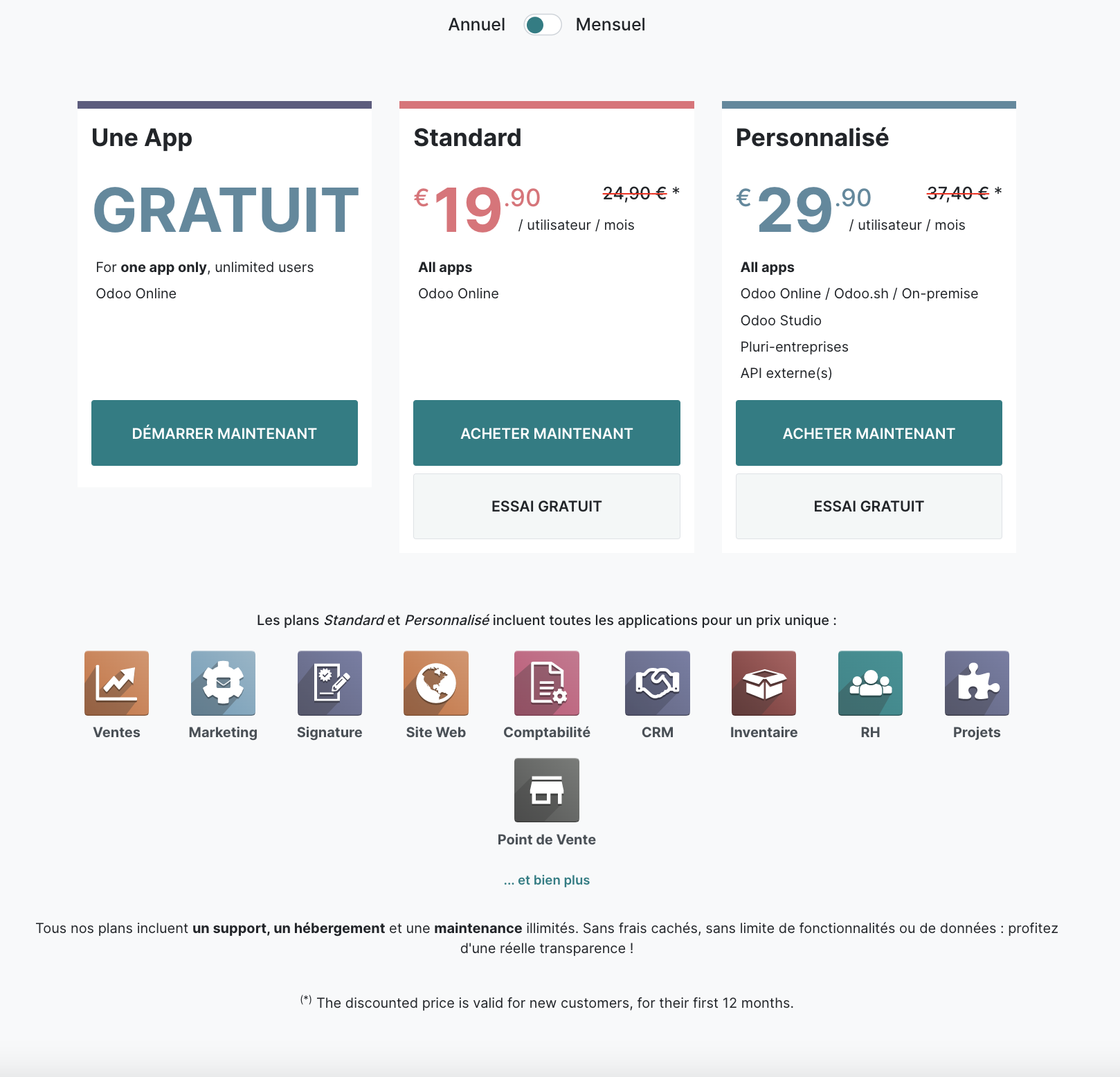 En effet, ces nouveaux tarifs incluent un prix par utilisateur sans limite d'applications. Grâce à cette nouveauté, Odoo offre aux PME la possibilité de mettre en place un logiciel de gestion d'entreprise complet et à moindre coût.